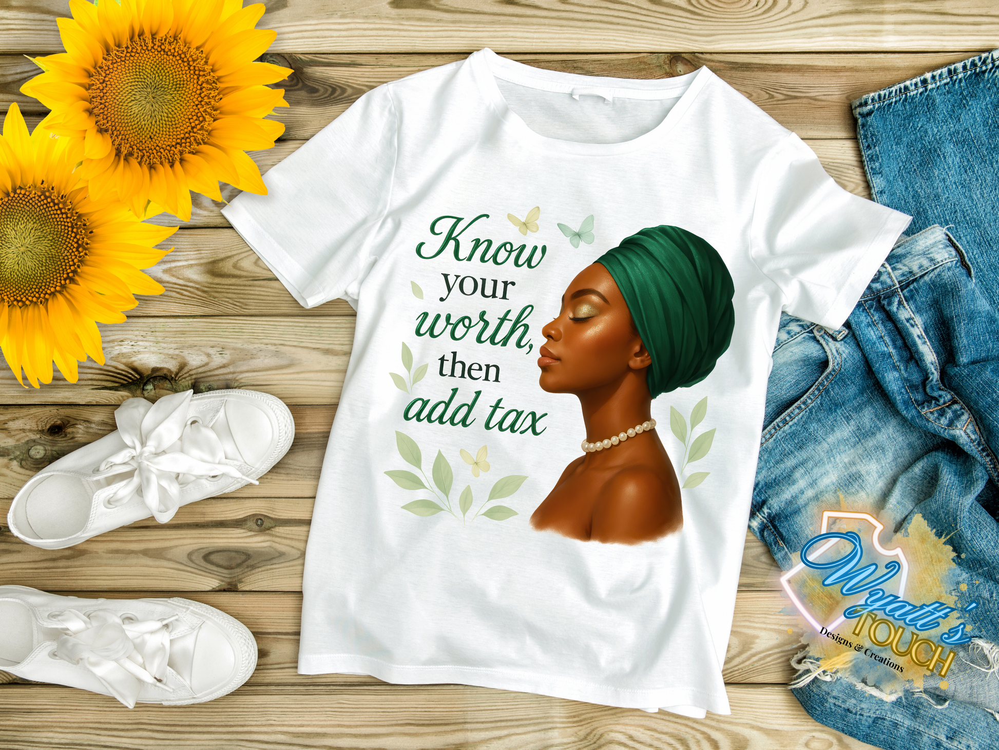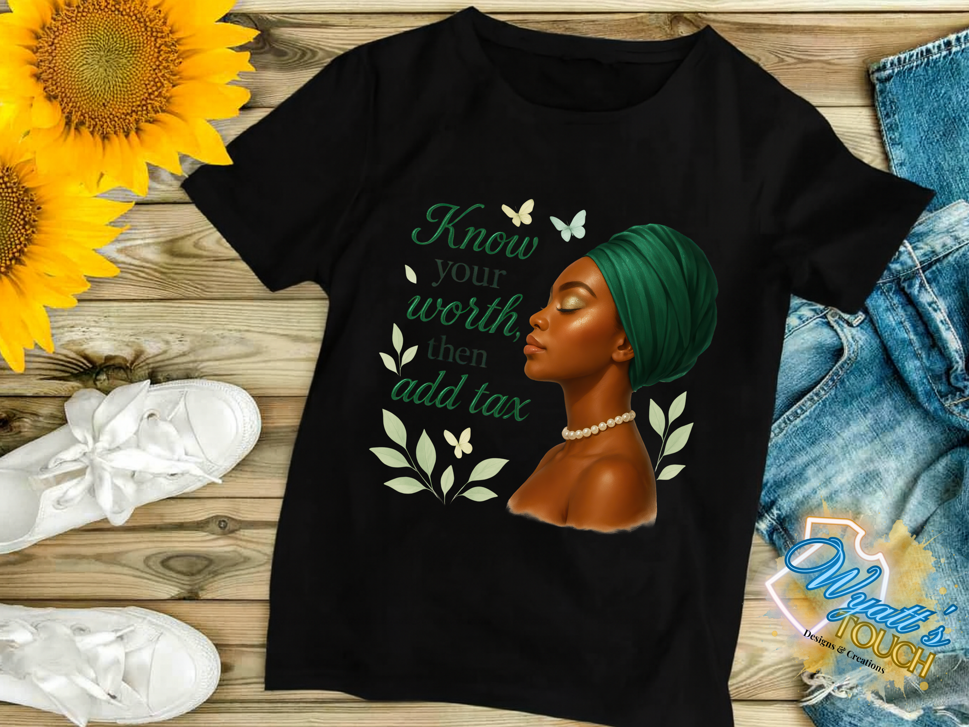 Step into your power with the “Know Your Worth, Then Add Tax” tee—a refined tribute to self-worth, elegance, and quiet strength. Featuring a radiant profile of a woman adorned in a deep emerald headwrap and luminous pearl necklace, this design blends natural serenity with bold affirmation. Soft green leaves and delicate butterflies frame her peaceful expression, while the quote delivers a message that’s both stylish and unshakably confident.