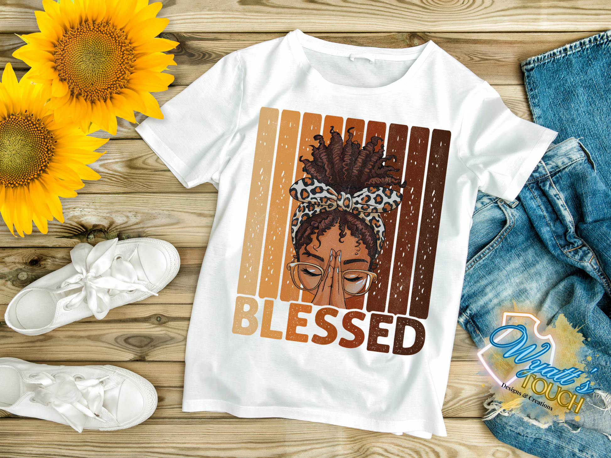 The “Blessed” tee is a visual prayer—an homage to inner peace, spiritual strength, and unapologetic beauty. Featuring a powerful illustration of a woman in quiet reflection, hands pressed together in reverence, this design radiates gratitude and grounded elegance. Her leopard-print headwrap, natural curls, and oversized glasses speak to individuality and style, while the vertical timber-toned backdrop evokes warmth, resilience, and rootedness.