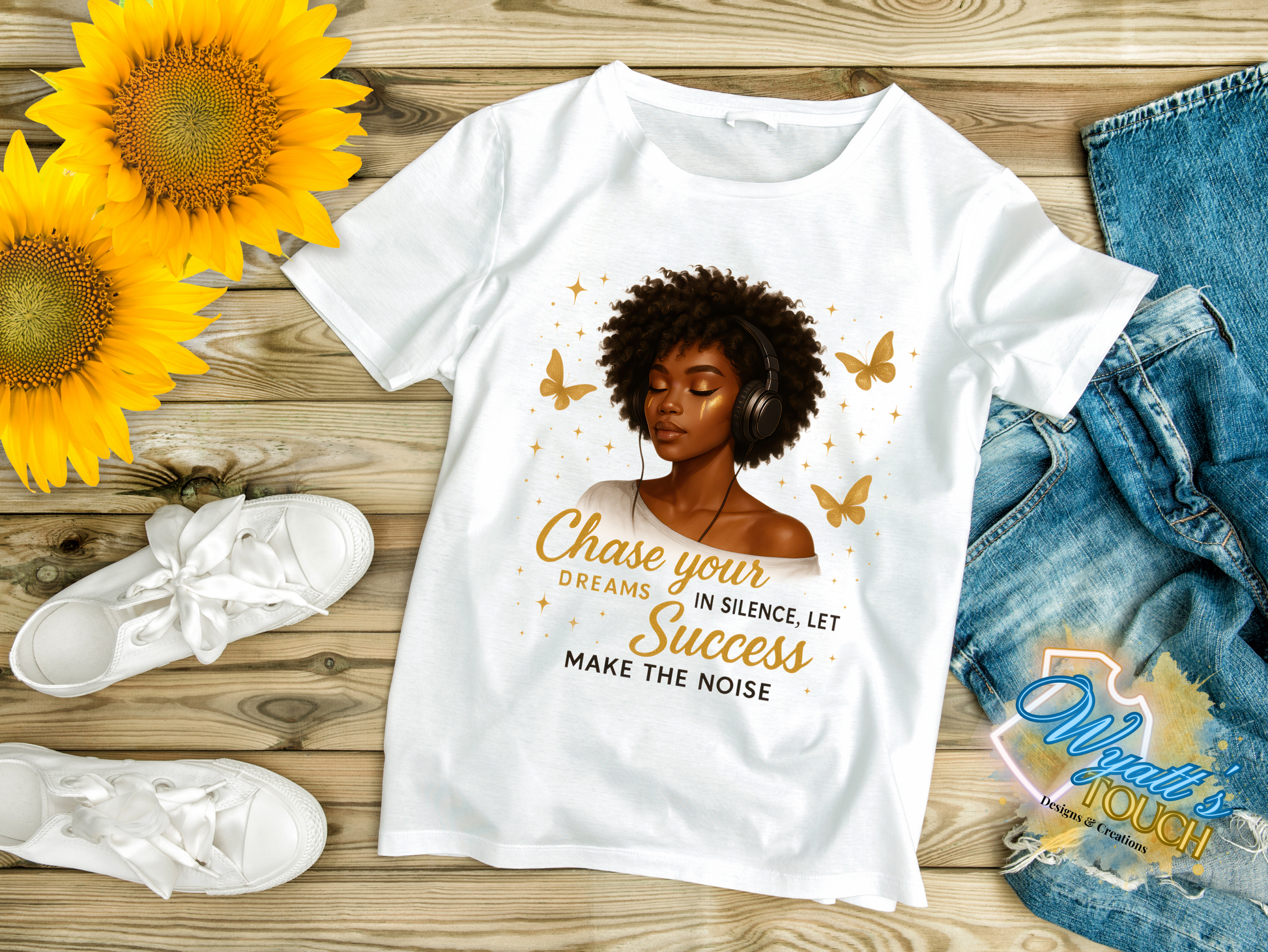 Let your ambition speak volumes—without saying a word. The “Chase Your Dreams in Silence” tee features a soulful illustration of a serene woman immersed in her own rhythm, eyes closed and headphones on, surrounded by golden butterflies and shimmering stars. Her peaceful expression and radiant glow capture the essence of focused determination, while the bold quote reminds us that true success doesn’t need to shout—it shines.