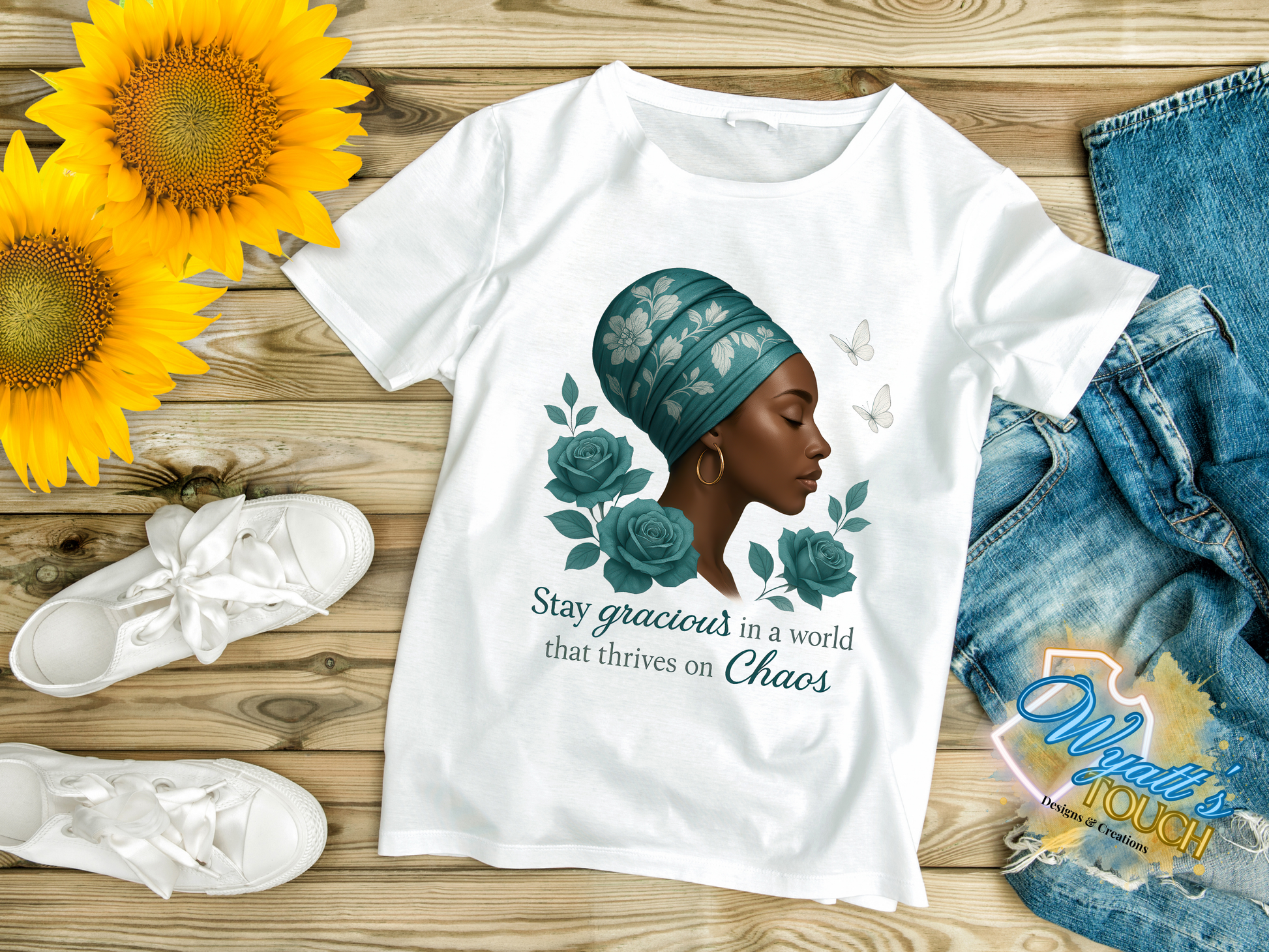 With “gracious” and “Chaos” artfully emphasized, this shirt becomes more than fashion—it’s a mantra. A reminder to rise above, stay centered, and move with elegance even when the world feels wild.